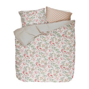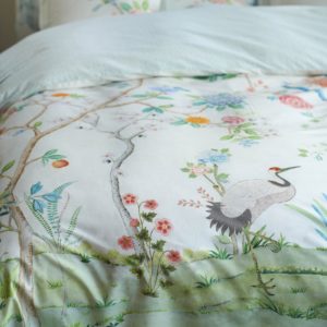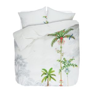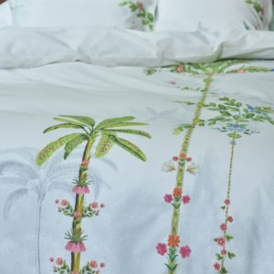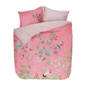 Die Good Morning gibt es in verschiedenen Farben, darunter Pink und Weiss. Auf der Bettdecke ist eine schöne Wiese zu sehen, von der Indische Bäume und Blüten empor wachsen. Mehrere außergewöhnliche Vögel zieren das Bild.