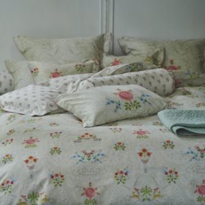 Auf der Jaipur Flower in Khaki oder Pink ist die Liebe zum Detail groß. Winzig kleine Blumen in Grün und Rot übersähen den Untergrund und sorgen für eine fröhliche Stimmung.